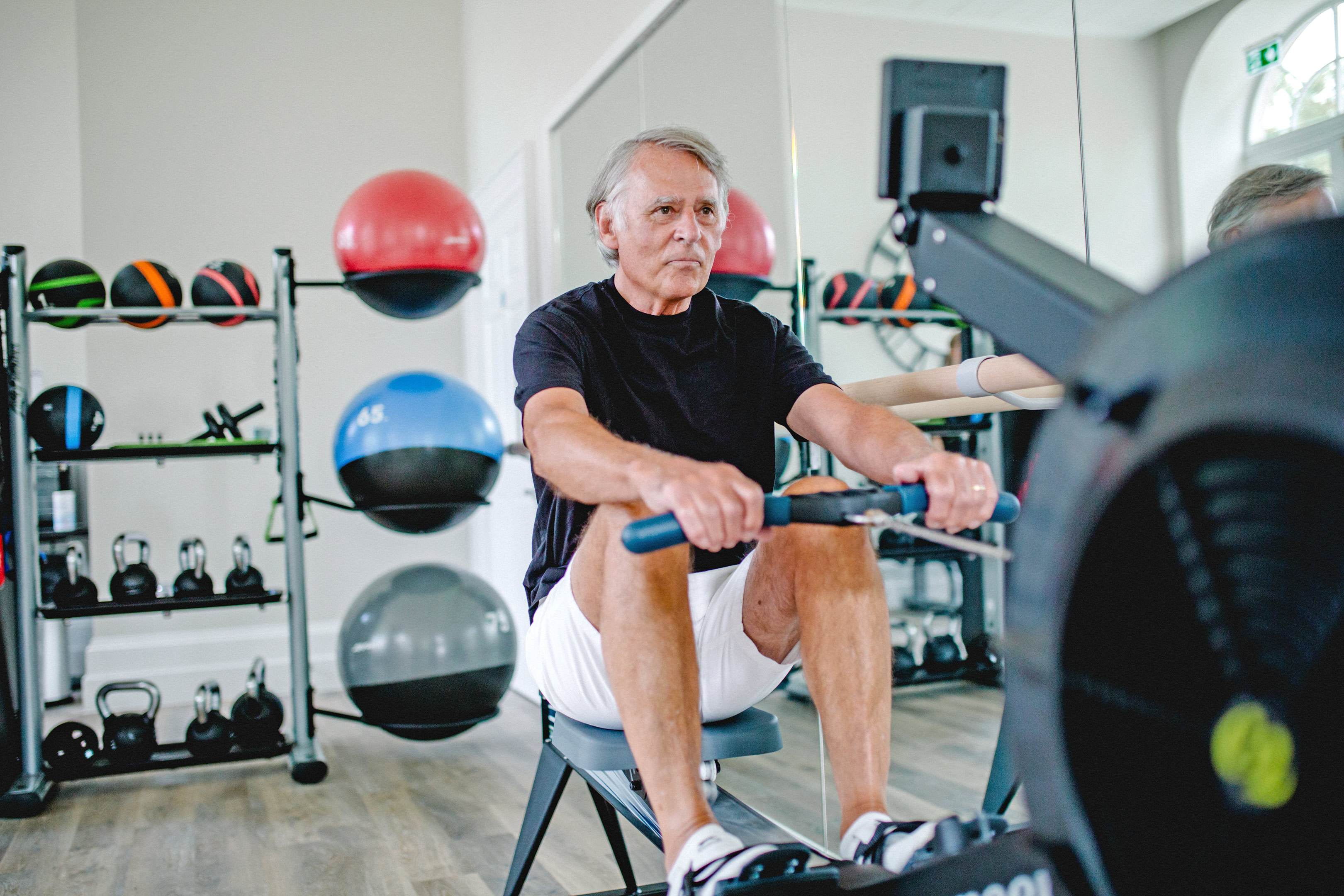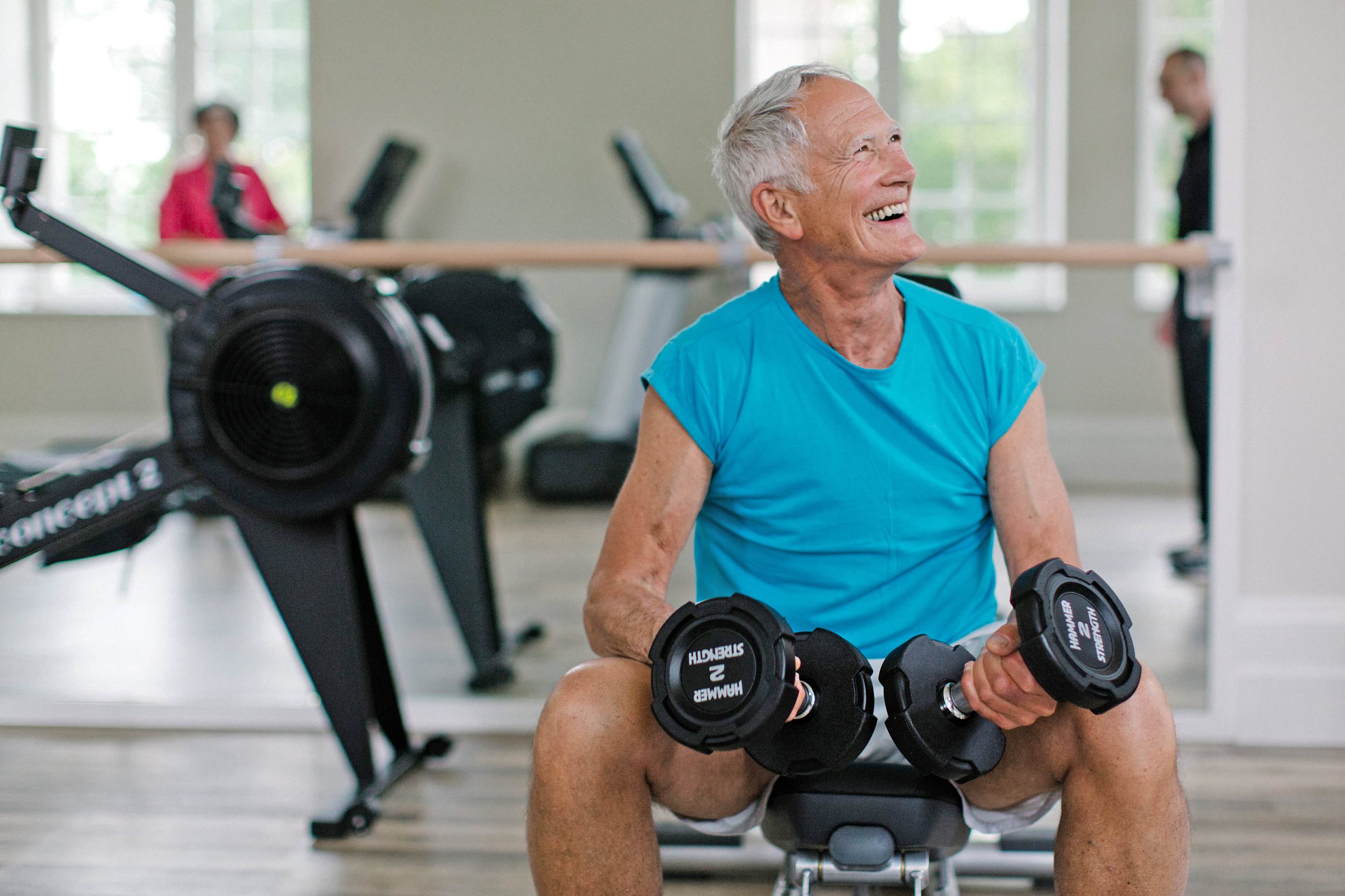 Older man in a bright blue shirt sits on a bench in a gym, holding two dumbbells and smiling. Exercise equipment is visible in the background.