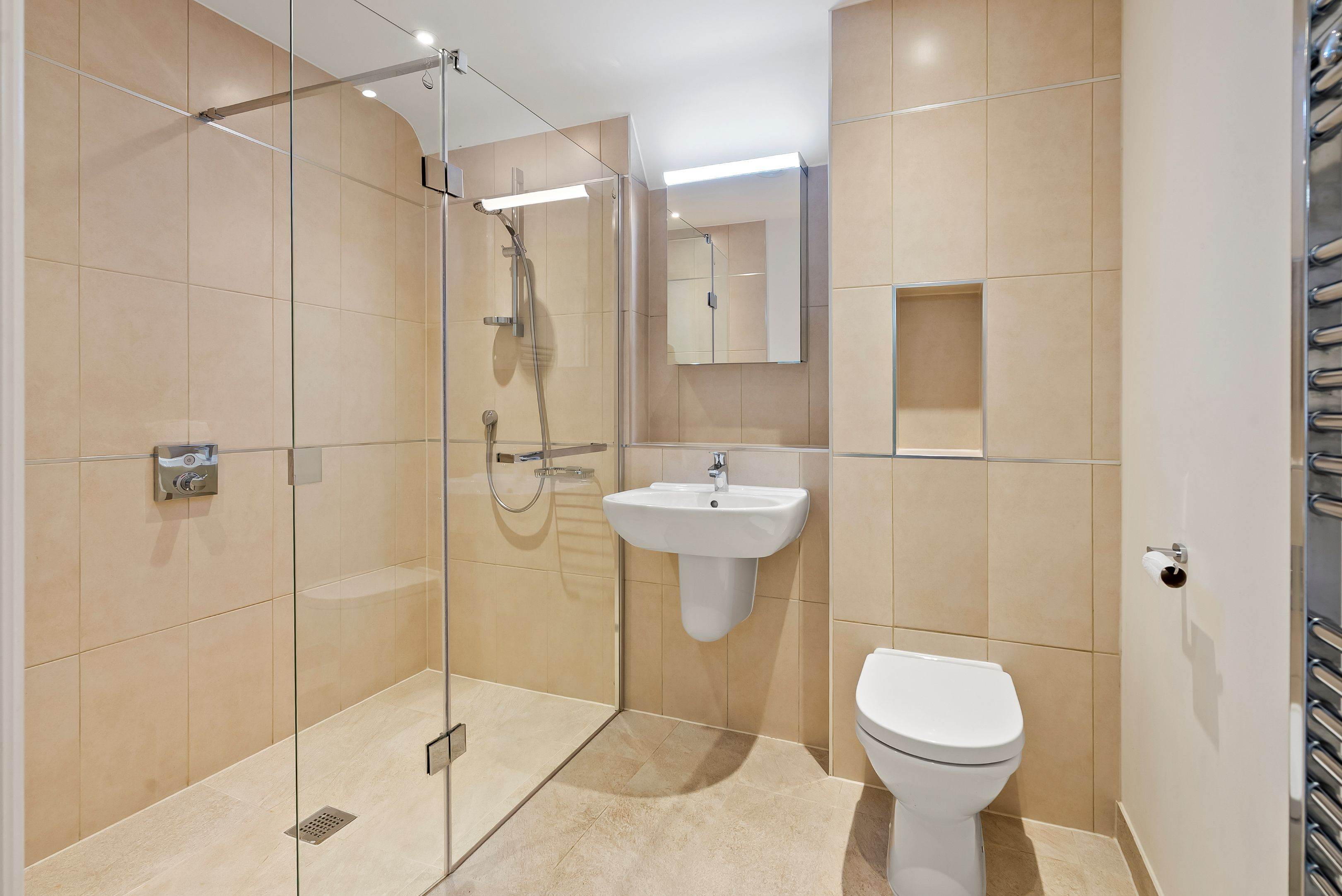 A generous sized bedroom and shower room.
