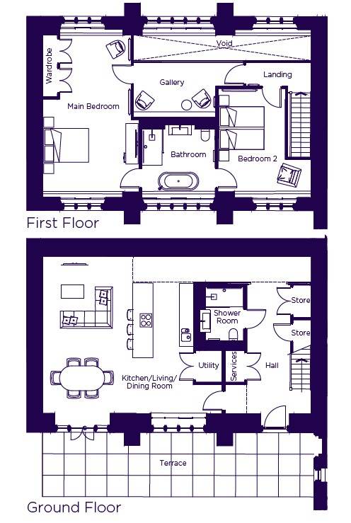 Originally the racquets court it later became the cinema as part of the Defence Medical Rehabilitation Centre. The door that sits outside was taken from a condemned cell at Newgate Prison. A double height lightwell with gallery over will express the original size of the room whilst bringing light from high level windows to the hall and living room below.