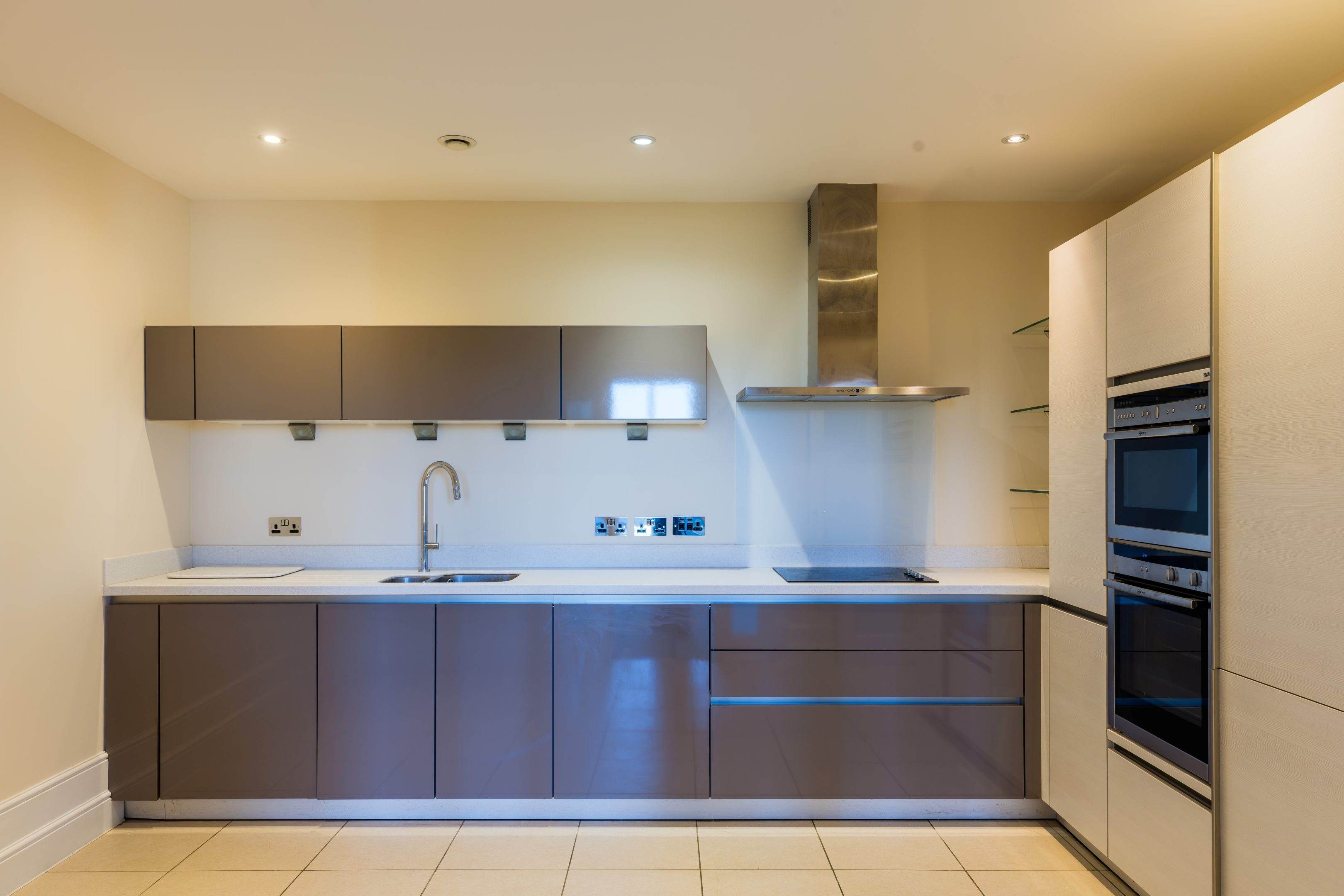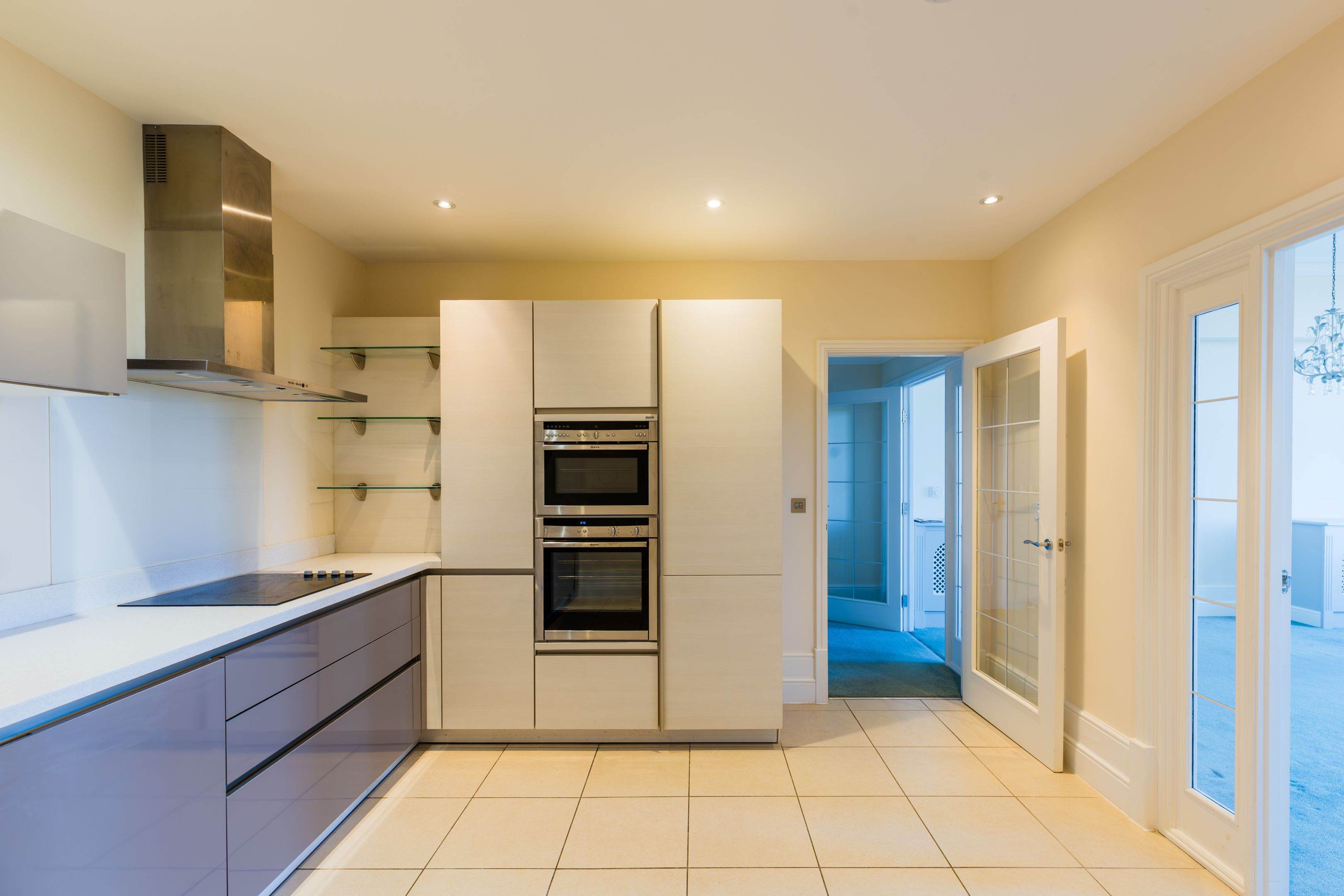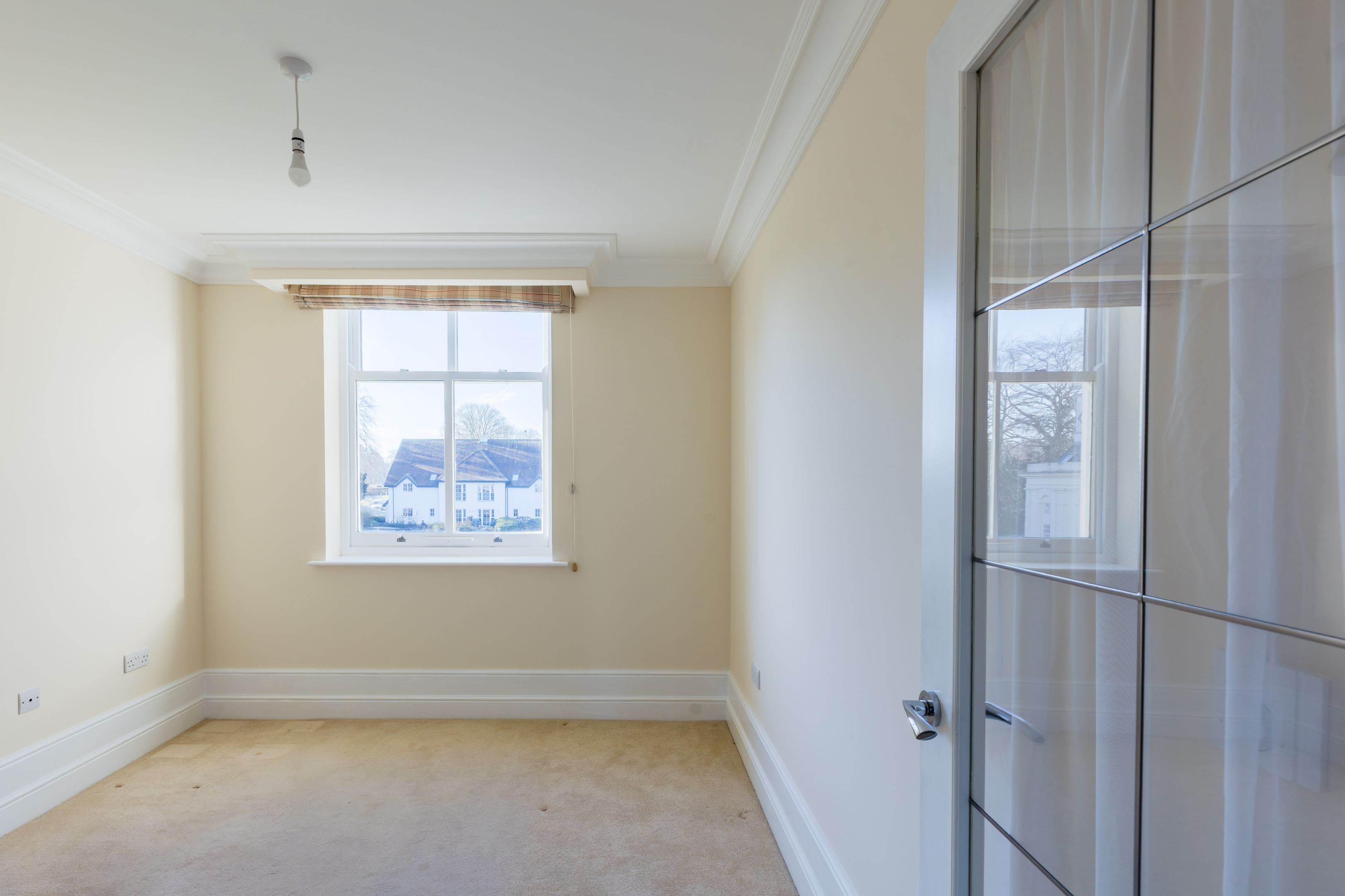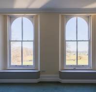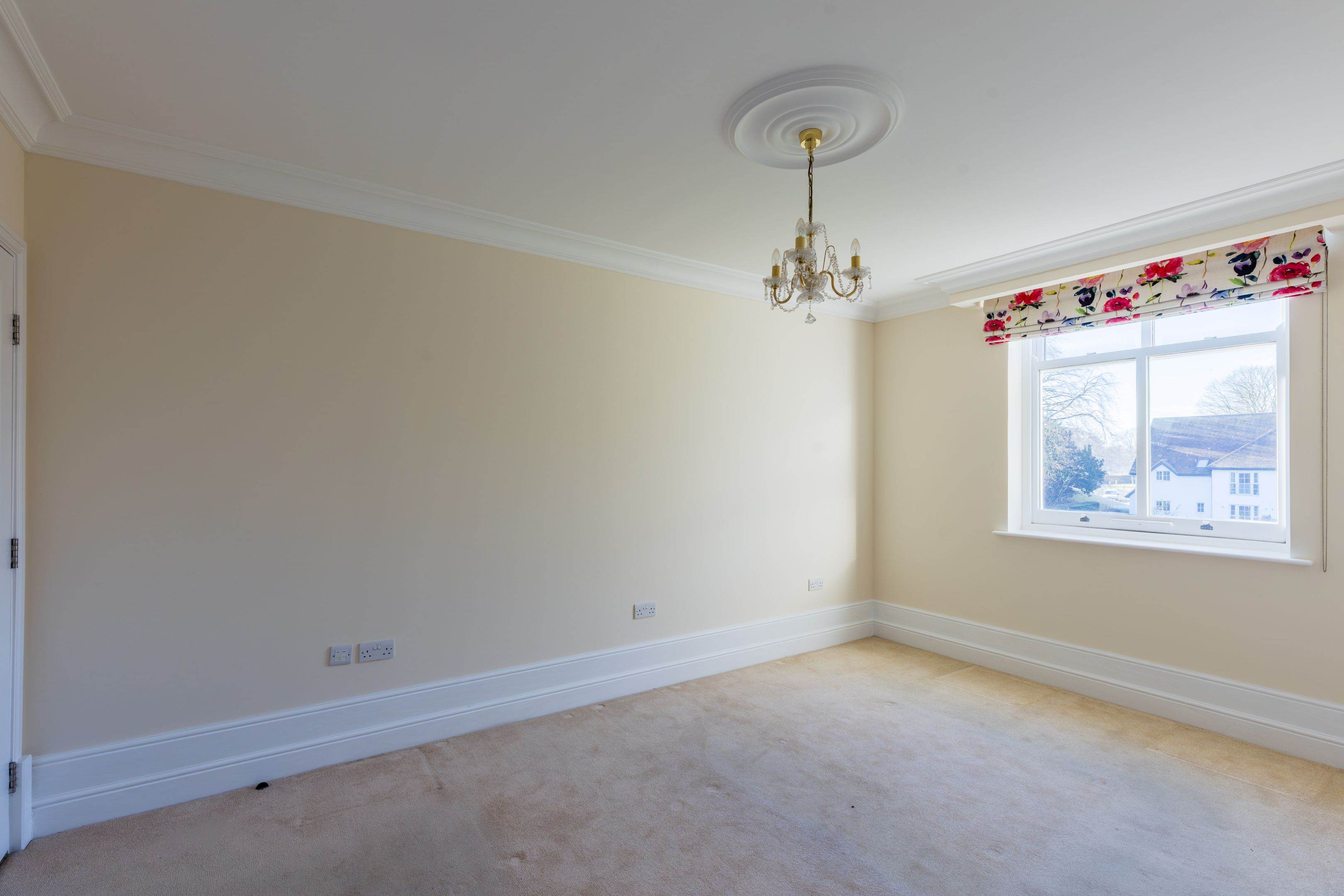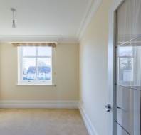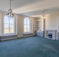 The apartment has striking high coved ceiling and dramatic double-height windows, creating an immediate sense of grandeur and light throughout. The generously sized living room enjoys fabulous countryside views and is complemented by bespoke fitted storage, providing both beauty and practicality.