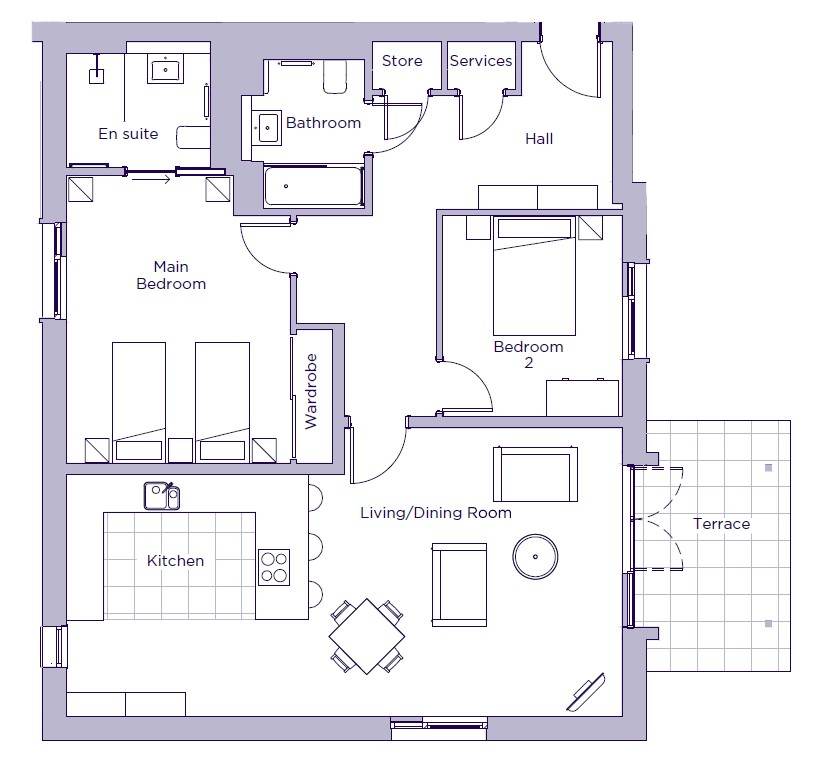 01344 859 200A stunning triple-aspect apartment located on the ground floor. There is a private south-east facing terrace which is accessible from the open plan kitchen/living room.